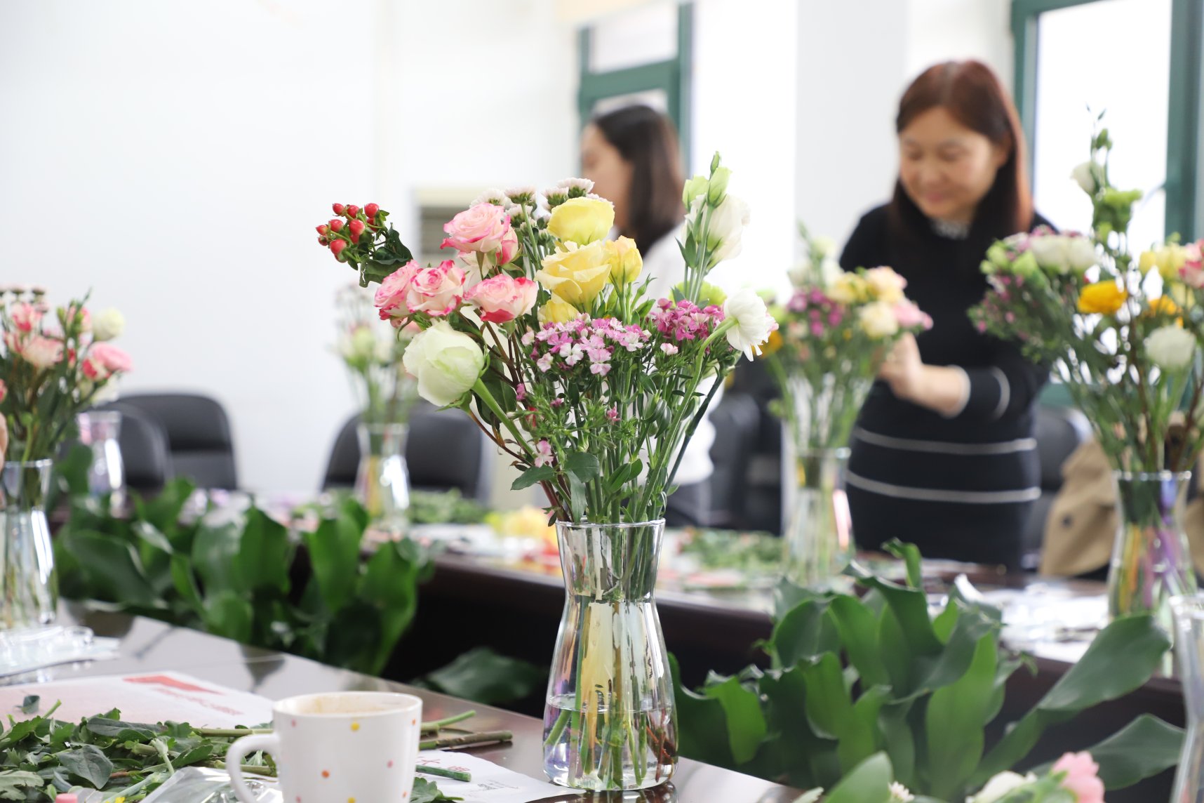 活动现场花香四溢,欢声笑语。花艺老师从选花、裁剪、搭配、造型等多方面讲解插花技巧,讲授各种花卉所蕴含的花语和祝福。大家一边侧耳倾听,一边亲自动手剪裁,活动现场成为一片花的海洋。大家在插花中寻找乐趣,从作品中获得满足,在交流中拉近距离,美丽的花束更传递了美好和祝福。