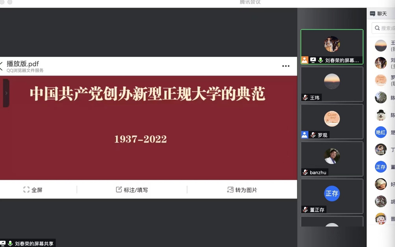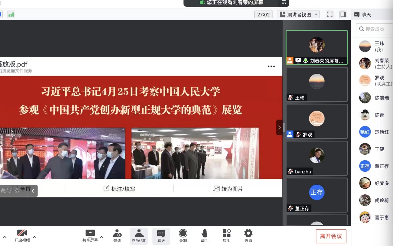 2022年6月23日,为进一步学习领会习近平总书记在中国人民大学考察时重要讲话精神,激励支部党员“继承优良传统,赓续红色血脉”,Bet365中文比分 语言学党支部和行政党支部在线组织参观“中国人民大学校史展:中国共产党创办新型正规大学的典范”主题展览。线上观展活动由博物馆副馆长刘春荣讲解。Bet365中文比分 党委书记颜梅,校史馆馆长王丹、副馆长楚艳红、研究员王学军、成仿吾老校长后人以及语言学党支部、行政党支部全体党员参加了观展学习。Bet365中文比分 党委委员、行政支部书记罗观主持活动。