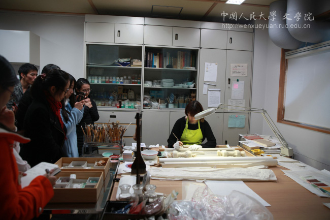 访日团一行来到了日本史料保存技术室,现场领略技术人员的摹写作业。史料保存技术室的日常工作以史料的影写、模写以及修复为主。技术人员热情而详细地介绍了字画复制、修复的流程,并亲身示范。古代字画作品的复制需要技术人员投入大量的时间和精力,前期需要收集和阅读大量资料,复制前要反复练习,复制过程中要对古人的创作心理进行仔细揣摩,整个过程都一丝不苟。访日团师生无不钦佩技术室工作人员的“匠人”精神及其对工作的诚挚热爱。