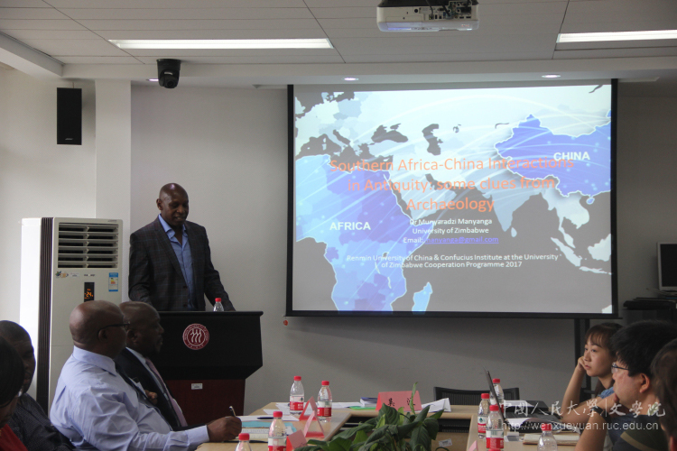 之后,讲座部分正式开始。首先,津巴布韦大学Bet365中文比分 高级讲师Munyaradzi Manyanga从考古学的角度出发,向大家展示了南非与中国交流的深厚历史渊源。他表示,从近些年来的政治、经济、文化交流和六七十年代的军事、物资援助向前追溯,早在公元六世纪,中国与南非就已经有频繁的贸易往来,而贸易往来又推动了双方在科技、文化上的交流。最后,他引孔子的“温故而知新”一语,指出这些历史上的交流为今天的南非与中国在考古学、历史学、历史遗迹保护与管理方面的深入合作提供了机会与借鉴。
