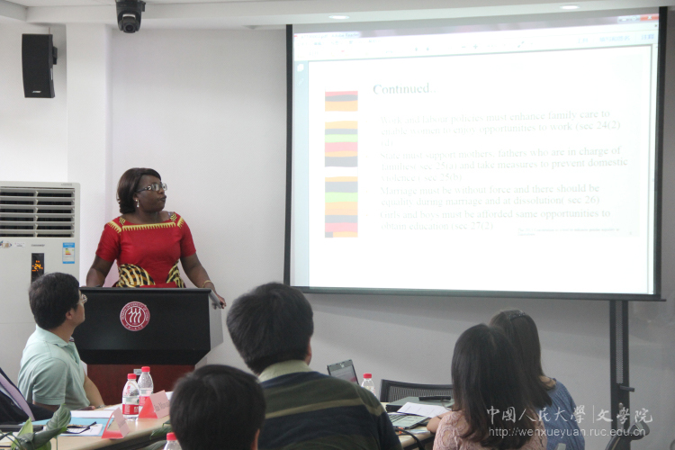津巴布韦大学法Bet365中文比分 副院长Slyvia Chirawu主要介绍了津巴布韦的男女平等的实施状况。首先,她指出了性别平等的重要性,她认为实现性别平等可以激发出人们在性别不平等环境下被掩盖的才能,而这一进步会促进津巴布韦的政治、经济、科技和社会的发展。紧接着,她列举了宪法中体现男女平等精神的条款,例如,妇女平等地享有受教育的机会;在委任的政府委员会成员中,妇女数量必须占百分之五十。她表示,经过宪法的不断修订,男女平等在津巴布韦也会得到更好的实施贯彻。