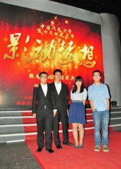 四位参与微电影拍摄的同学在导演2012级谭玮的带领下与全场观众见面并鞠躬致意。
