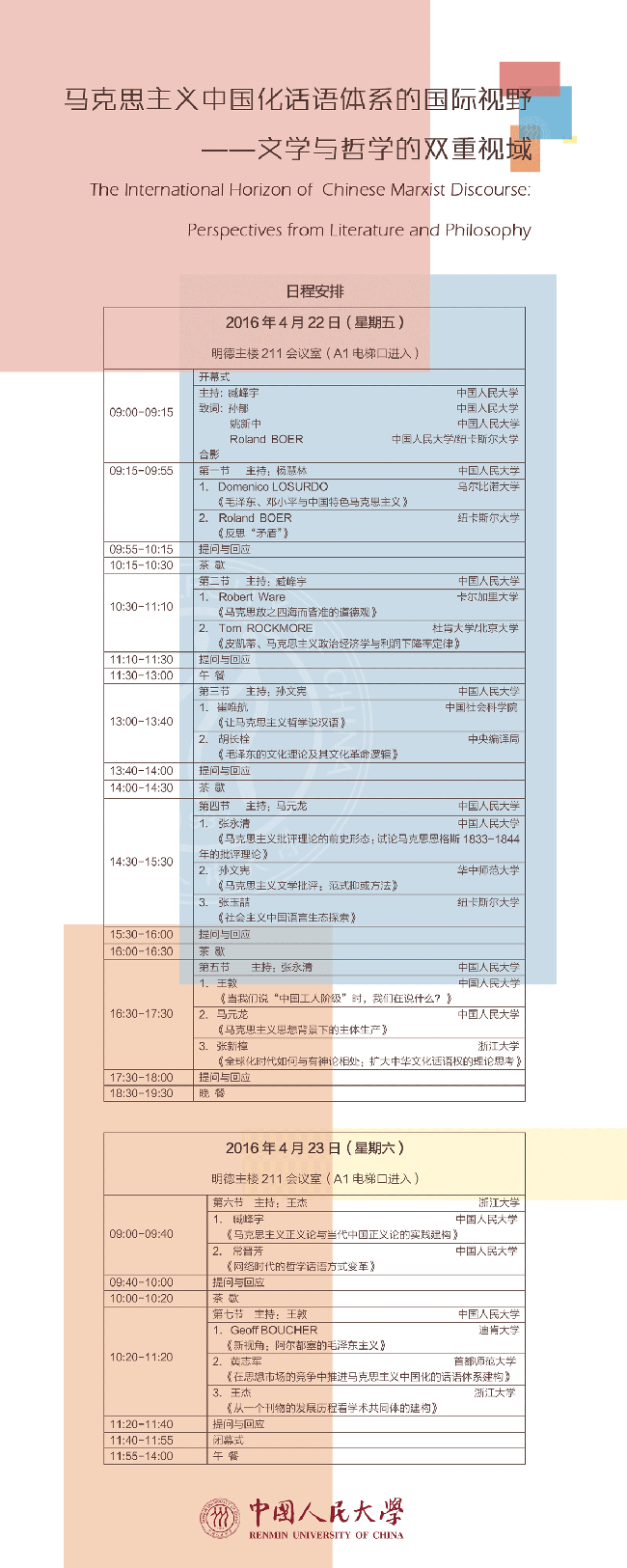 将于4月22日(周五)、23日(周六)举办“马克思主义中国化话语体系的国际视野——文学与哲学的双重视域”(The International Horizon of Chinese Marxist Discourse: Perspectives from Literature and Philosophy),诚邀感兴趣的老师与同学到场参与讨论!