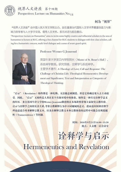 【摘要】“启示”(Revelation)始终都是一种礼物,无法随意被制造,但是它的确需要人去主动接受。因此,“启示”又始终是人类在某个具体环境中的体验,始终是一种具有诠释学意义的经历。来自英国格拉斯哥大学的Werner Jeanrond教授将在本场讲座带领大家探究宗教经验、启示与诠释学之间的复杂关系。教授将通过与施莱尔马赫(Friedrich Schleiemacher)、奥托(Rudolf Otto)、伊利亚德(Mircea Eliade)及大卫·特雷西(David Tracy)等哲学大家对话,考察宗教解释行为中不同视域的意义,进而追问何种诠释学理论最适合用来解释宗教文本,以及在解释宗教文本和宗教体验的过程中可能会出现超越性(transcendence)等问题。
