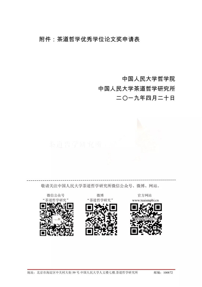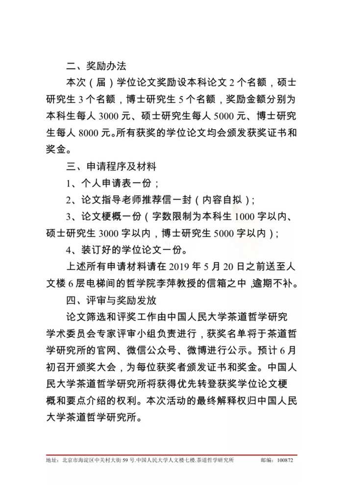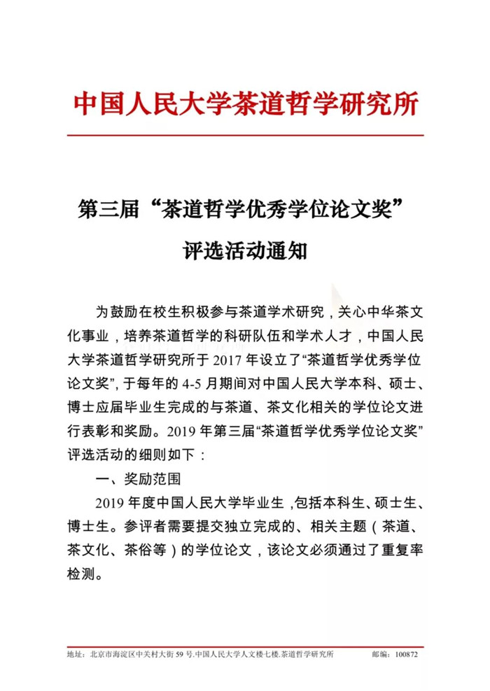为鼓励在校生积极参与茶道学术研究,关心中华茶文化事业,培养茶道哲学的科研队伍和学术人才,中国人民大学茶道哲学研究所于2017年设立了“茶道哲学优秀学位论文奖”,于每年的4-5月期间对中国人民大学本科、硕士、博士应届毕业生完成的与茶道、茶文化相关的学位论文进行表彰和奖励。2019年第三届“茶道哲学优秀学位论文奖”评选活动的细则如下: