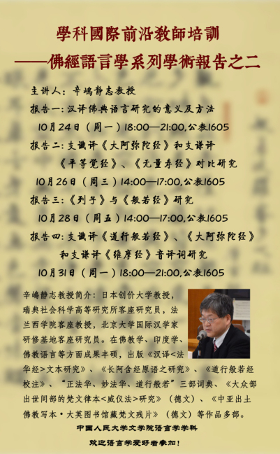 辛嶋静志教授, 10月26日(周三)14:00—17:00,公教1605
