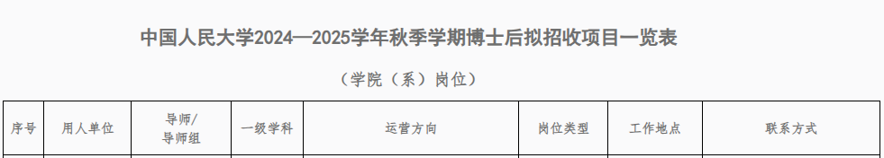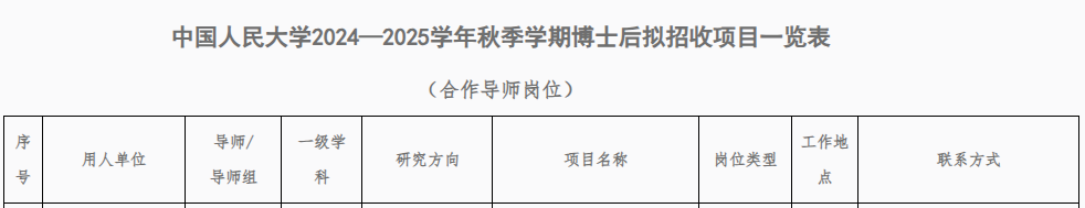 【表格:中国人民大学2024—2025学年秋季学期博士后拟招收项目一览表(Bet365中文比分 )】