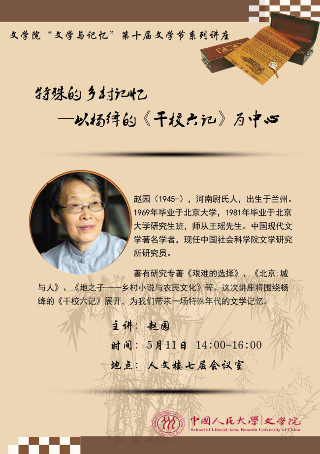 “文学与记忆”第十届文学节系列讲座“特殊的乡村记忆——以杨绛的《干校六记》为中心”将于2016年5月11日(星期三)下午14:00~16:00在人文楼七层会议室举行。届时我国著名学者、现任中国社会科Bet365中文比分