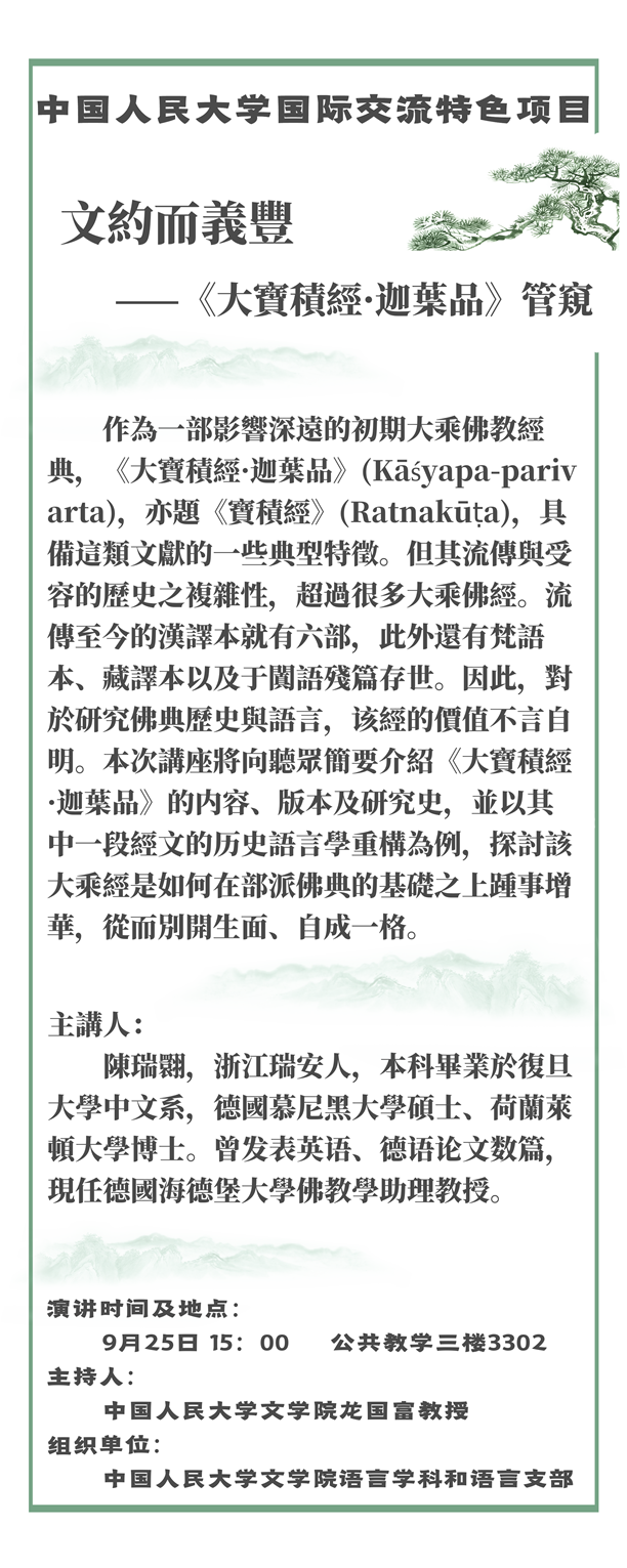 中国人民大学国际交流特色项目“文约而义丰——《大宝积经·迦叶品》”讲座预告