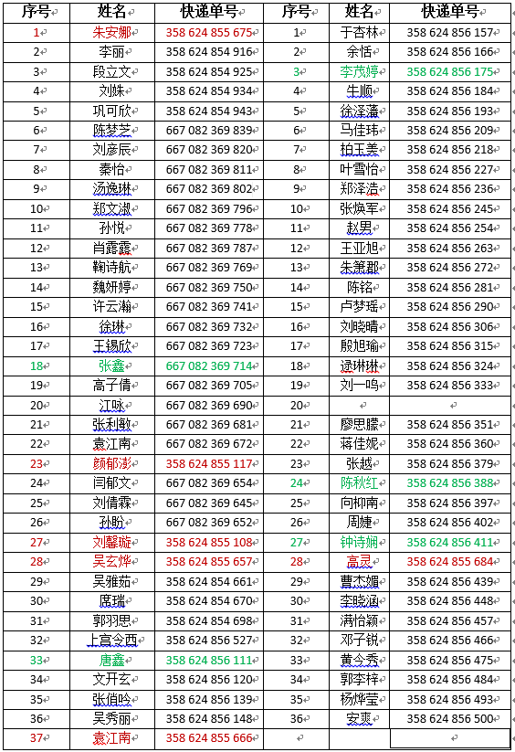 Bet365中文比分 2018年拟录取学术型硕士研究生录取通知书已于2017年6月26日寄发,寄发邮件采用顺丰到付形式,寄发快递单号见下表格,请各位同学留意查看(红色标记为修改过地址的,绿色标记为未能拿到录取通知书的):