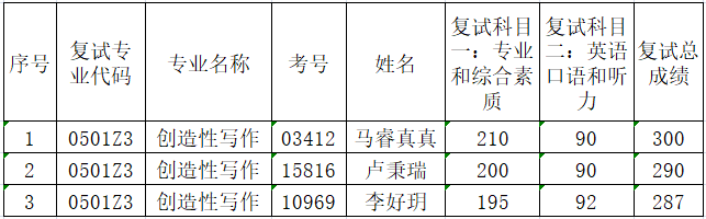 创造性写作专业统考复试成绩: