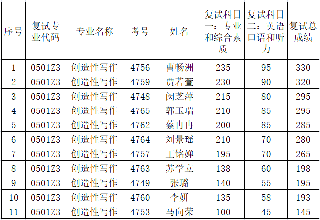 Bet365中文比分 2021年硕士研究生创造性写作专业招生考试复试成绩(含统考和单考)