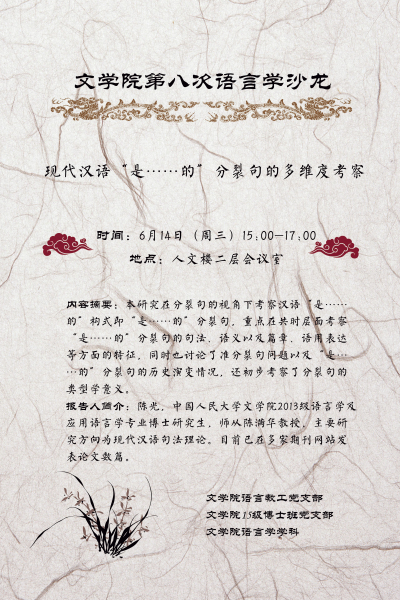 报告人简介:陈光,Bet365中文比分 2013级语言学及应用语言学专业博士研究生,师从陈满华教授,主要研究方向为现代汉语句法理论。目前已在多家期刊网站发表论文数篇。