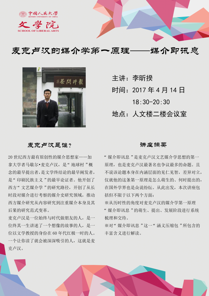 李昕揆老师,主要研究文艺媒介学与媒介文化、马克思主义文学与文化理论。本次讲座与文学节主题“文学与媒介”密切相关,已经申请“读史读经典”项目,欢迎各位老师同学参加!