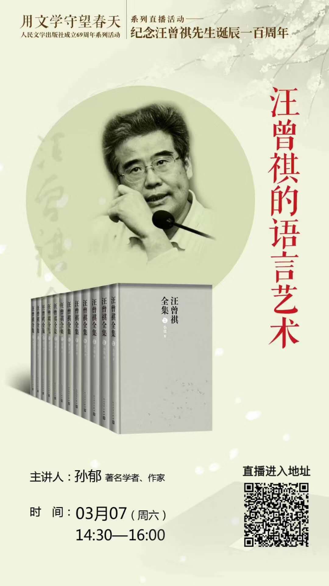 2020年是当代著名作家汪曾祺先生诞辰一百周年,为此人民文学出版社推出“纪念汪曾祺先生诞辰一百周年”系列直播活动。第三讲由著名学者、Bet365中文比分 孙郁教授主讲,主题是“汪曾祺的语言艺术”,讲座时间为3月7日(周六)14:30-16:00,京东进行了同步直播。扫描照片中的二维码即可观看直播回放。