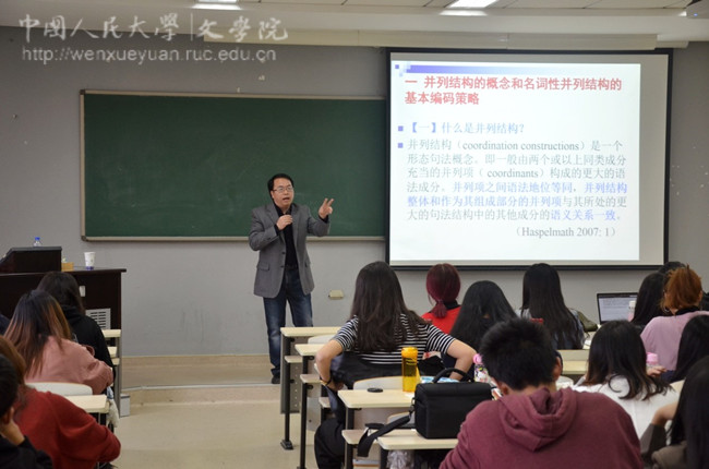 接着,宋文辉老师就现代汉语名词性并列结构展开论述。宋老师首先指出,所谓并列结构就是由两个或两个以上语法单位组成的并列项加上用以连接并列项的并列符构成的句法结构。名词性并列结构的编码模式可以分为黏合式、组合式及混合式三种,其中组合式并列结构又可分为单连接型和双连接型两类。显著的多样性是现代汉语名词性并列结构编码策略的主要特点,但细细研究就会发现,汉语中黏合式是明显占优势的一个类型,且并列符使用的强制性很弱,即便出现组合式也总以单连接型为主,这是汉语不同于他国语言的特殊之处,由此,宋文辉老师举出了大量英语,芬兰语等他国语言中的名词性并列结构模式,引导同学们在不同语言的比较中感悟这一深刻的理论。