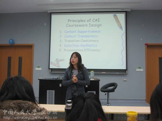 22日晚的讲座以“建构主义理论框架下的对外汉语教学语料分析与课件设计”为题。“在有教材的情况下,为什么还需要课件?”江教授在讲座一开始就提出了这样一个问题。她认为,课件的目的是使课堂更加生动、形象,在此前提下进行课件设计才可能有好的效果。结合认知理论和基模理论,江岚教授认为,在教学最高目标之下,教师需要对语料进行内容分析,对学生进行需求分析,由此设计课件,最后进行教学并进行评估。