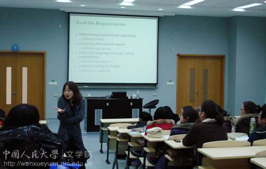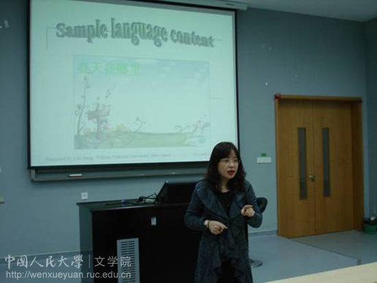 ,以“美国对外汉语课堂的特色及其对持照汉语教师的教学技能要求”为题与同学们进行了轻松的交流。