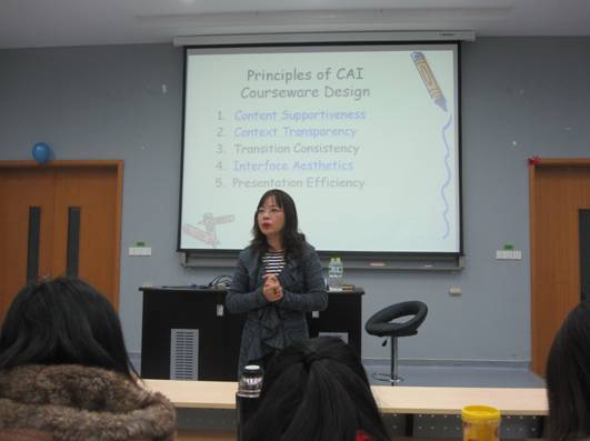 她将课件设计的关键点概括为内容呈现生动形象、内容清晰易懂、变换前后统一、界面美观、展示保证效率等五原则,并认为而能够制作课件的基础之一是清晰地了解课程内容。以汉字教学为例,英语是从字母到词再到句子,而汉语是从笔顺到部件到字,再到词和句子,以拼音文字为母语的汉语学习者会感到困难,但从教学之初就要强调清楚,手段之一就是清晰的课件设计。