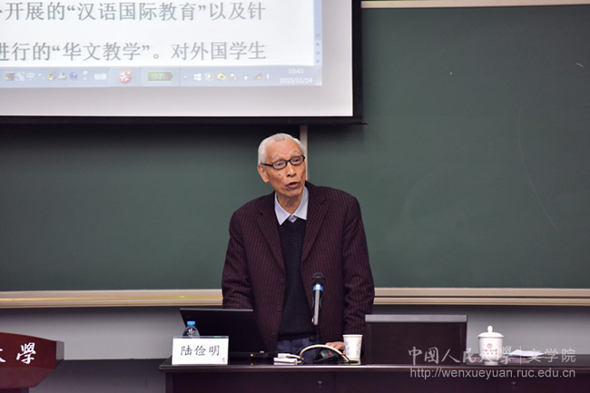 陆俭明教授强调,在汉语教学过程中,应当正确认识、处理好汉语教学与文化教学的关系。当下的对外汉语教学课堂中,存在着重文化,轻语言教学;重固态、物质文化传播,轻心态、精神层面文化传播的现象。一味地在课堂上大搞文化技艺活动,只会喧宾夺主,冲淡语言教学,结果“拣了芝麻,丢了西瓜。”他指出,文化教育必须浸润在汉语教学之中,坚持汉语言文字教学不动摇,处理好语言基础教学和文化传播的关系,才能实现汉语传播与中华文化传播的双赢。同时,汉语教师作为传播中华文化的形象大使,应当注意通过一言一行来树立汉语的国际形象,提高中华文化自身吸引力,确保汉语稳步健康的走向世界。