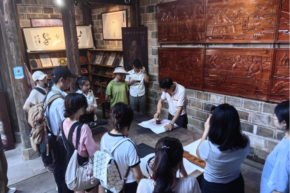 7月7日下午,研学团启程前往闽越王城博物馆,探寻古老的历史记忆,追溯古闽文化之源。博物馆以图表、文字、实物、复制品的形式,集中展示了距今2110多年以前南方少数地方政权,闽越国从汉封立国直到叛汉终被剿灭的百余年历史。作为福建迄今为止考古发掘面积最大的田野遗址,闽越王城遗址被评为世界文化遗产。漫步其间,宫殿苑囿错落矗立,大小园林池沼有序相接,大家依稀可见当年闽越王国的泱泱气象。随后,调研团师生来到建阳区书坊古镇。南平市级建本雕版印刷代表性传承人黄行忠老师为研学团师生现场演示古老的雕版技术,黄老师为同学们展示了从备板到刻板再到印刷装帧的完整流程,并邀请同学们亲身体验,从中探究建本之源,领略传统文化的迷人魅力。