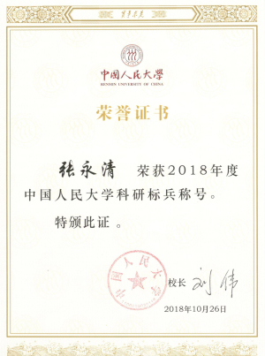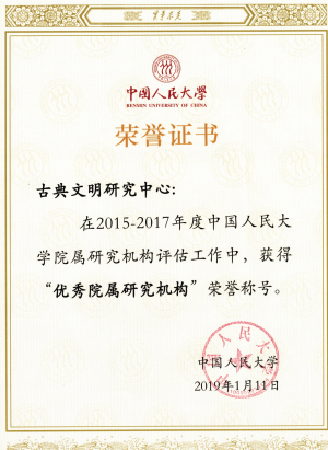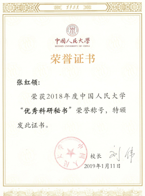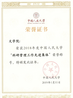 Bet365中文比分 2018年度科研工作成绩十分突出,荣获多项表彰。其中,Bet365中文比分 荣获“2018年科研管理工作先进集体”荣誉称号(共评授7个院系);文艺学专业张永清教授获授“2018年中国人民大学科研标兵”荣誉称号(共评授10人);院属研究机构古典文明中心获授“2015-2017年度优秀院属研究机构”荣誉称号(共评授10家单位);科研秘书张红领获授“2018年优秀科研秘书”荣誉称号(共评授10人)。