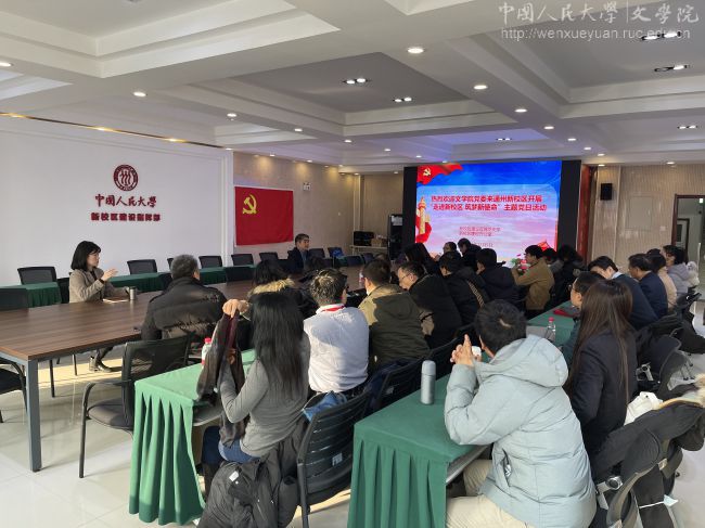 王甫银首先带领各位党员认真学习了习近平总书记关于京津冀协同发展、副中心建设的重要论述,重温了习近平总书记致中国人民大学建校80周年的贺信,并详细介绍了北京城市副中心建设进展、新校区周边区域规划建设情况、新校区规划建设最新进展和下一步工作计划。