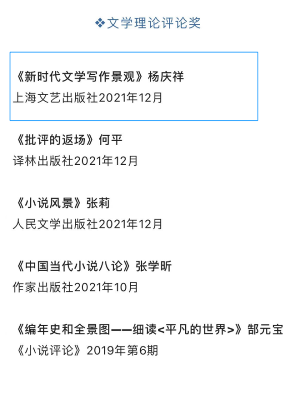 杨庆祥教授此次获奖作品《新时代文学写作景观》是关于中国新时代文学现象、写作潮流和代表性作家作品的最新评论著作,重点讨论了新时代文学写作的新成就、新趋势,着重辨析了“青年写作”的坐标系、非虚构写作的可能和当下症候,以及新南方写作、科幻文学、AI写作等新类型写作方向;并且以徐则臣、李修文、鲁敏、葛亮等九位活跃在原创文学前沿的青年作家的代表作为解读范本,展现了新时代青年写作的蓬勃之气,勾勒出具有创造力且富有多样性的新时代原创文学写作景观。