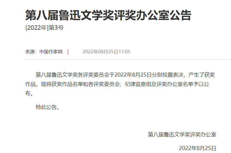 鲁迅文学奖是以中国新文化运动的伟大旗手鲁迅先生命名的文学奖项,是中国具有最高荣誉的国家级文学奖之一。该奖项每4年评选一次,由中国作协组织专家投票决出,分中篇小说奖、短篇小说奖、报告文学奖、理论评论奖、散文奖、诗歌奖和翻译奖7类,旨在奖励文学创作和翻译,推动中国文学事业的繁荣发展。从1997年第一届,至今已评出8届。本届一共评出35篇(部)获奖作品。