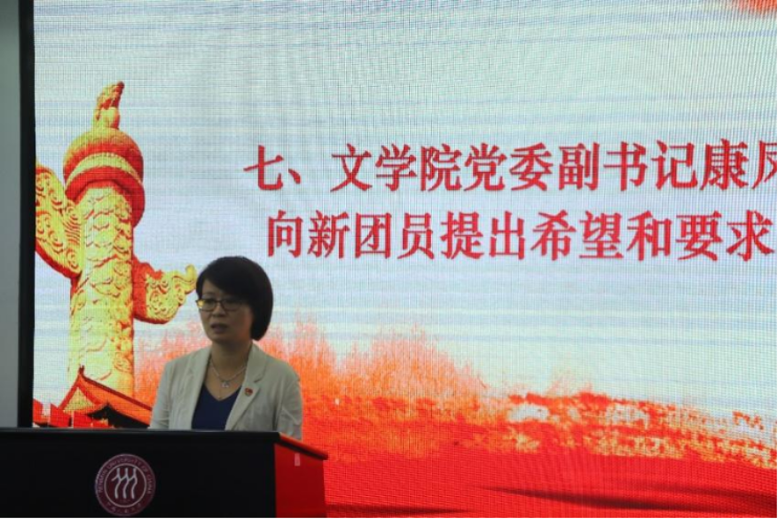 康凤发言。她表示,入队、入团、入党是青年追求政治进步的‘人生三部曲’”,希望每一位新加入中国共产主义青年团的同学都能走好这“三部曲”,在历史潮流中确立人生目标,在学习生涯中锤炼过硬本领,发挥团员先锋模范作用,用实际行动践行入团誓言,践行习近平总书记对人大学子的殷殷嘱托。
