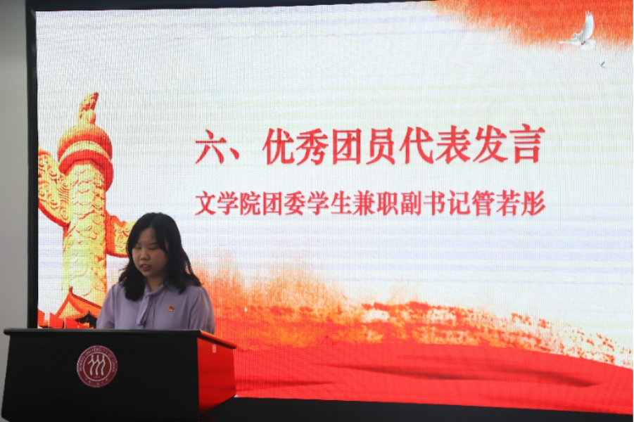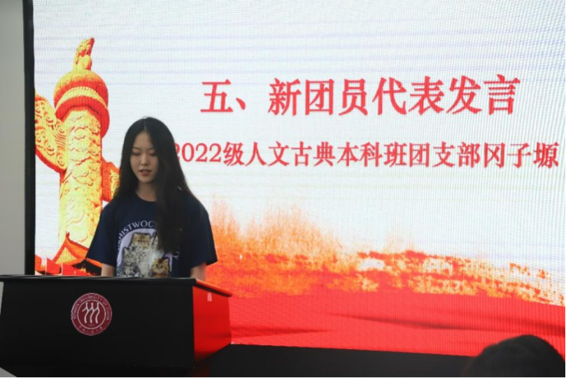 2022级人文古典本科班团支部冈子塬同学作为新发展团员代表发言。她结合自己参加“重走校史路”“千人百村”等实践活动的经历,表示自己在接受团组织培养过程中,进一步坚定了理想信念,希望能用自己所学投入到为党和人民服务的事业当中。她将增强理论与实践学习,争做有灵魂、有本事、有血性、有品德的新青年。