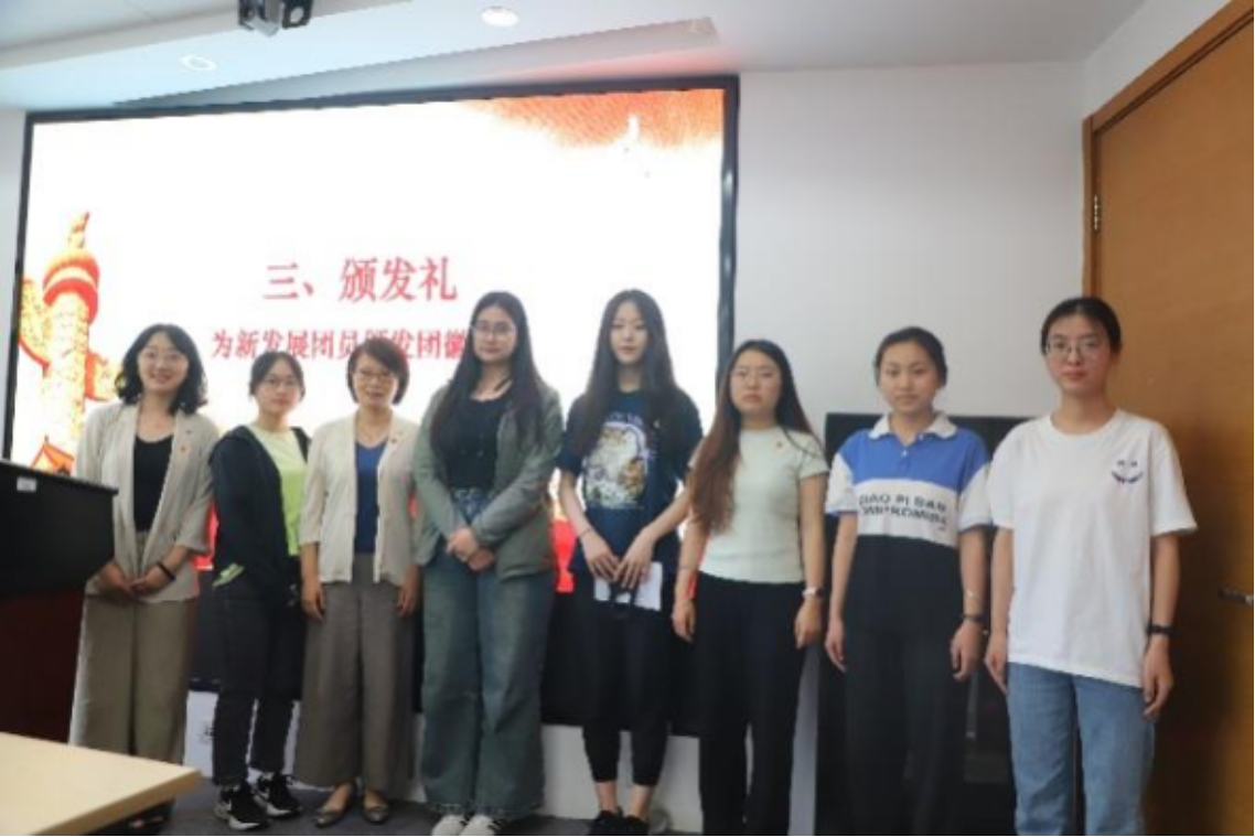 康凤、罗观和2021级古文字强基班团支部书记薛路怡,2022级人文古典本科班团支部书记陈慧婷,为新团员们颁发团徽徽章。