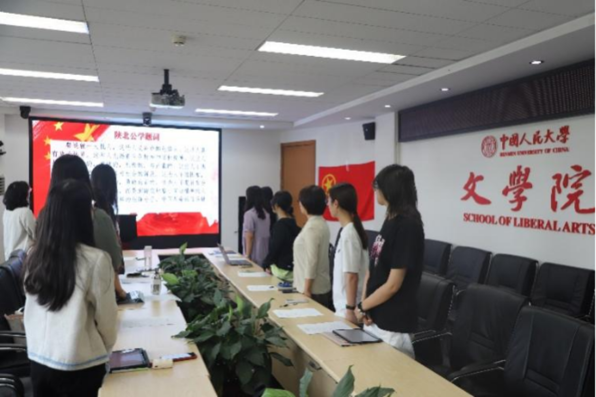 讲话结束,在场师生在2023级硕士2班团支部书记陈可扬的领读下,齐诵陕北公学题词,回顾那充满激情与奋斗的岁月。陕公精神在一代代人大人的接续奋斗中生生不息、星火相传。