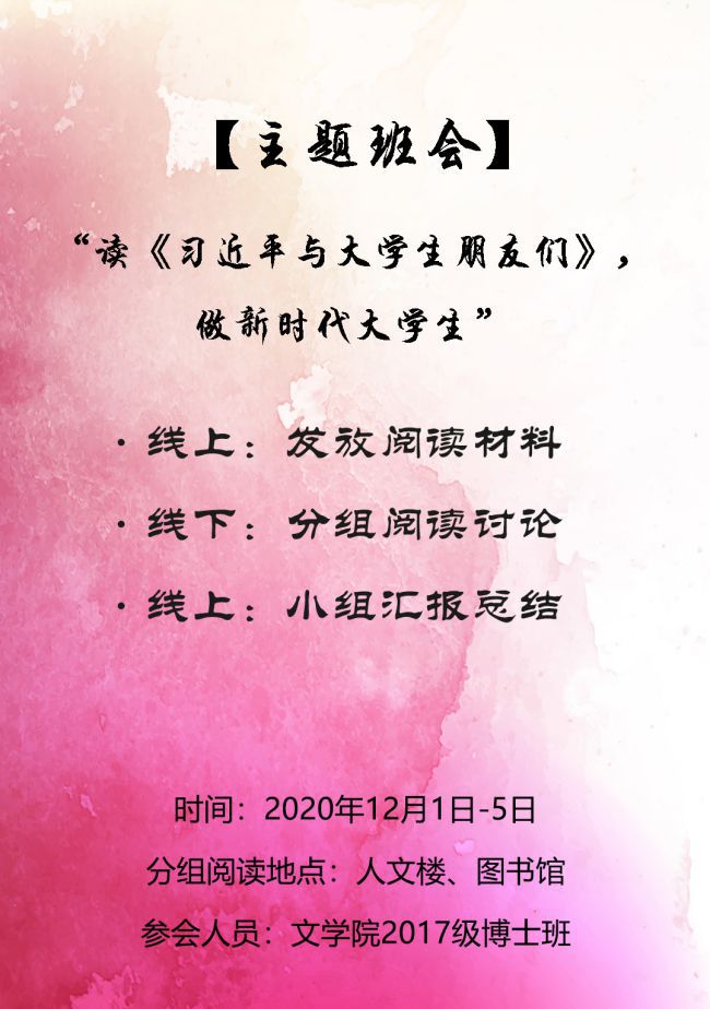 2017级博士班采取线上、线下相结合的方式,开展了以“读《习近平与大学生朋友们》,做新时代大学生”为主题的读书会活动,并制作活动海报鼓励同学积极参与。该班于12月2日至4日组织学生在人文楼、图书馆进行线下分组阅读。12月5日,同学们在线上分小组汇报阅读体会,交流学习成果。他们表示“少年强则国强”,习近平同志一直重视人才,强调人才对于建设国家的重要意义,鼓励大学生为实现中华民族伟大复兴而努力奋斗,这正是他们努力的方向。