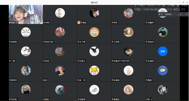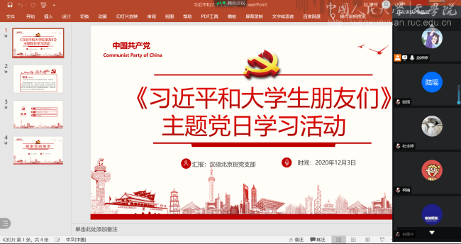 汉语国际教育硕士北京班以线上形式,围绕《习近平与大学生朋友们》一书展开主题学习活动。党支部书记赵婷婷先对此书做了大致介绍,围绕“解决矛盾、敢于斗争”问题分享了自己的感悟。其他党员同学也各抒己见,如钟儒平同学用两个“工作”概括自己的学习感悟,分别是党建工作和基层工作,并就这两个“工作”展开具体分析,如推动校园党建来引领青年一代的发展等。2019级汉语国际教育硕士一班也在线上开展《习近平与大学生朋友们》共享读书会。会上由班级班长、党支书、团支书、研会主席等八名同学,就基层工作、学生工作经验、乡村调研经历、海外孔子Bet365中文比分