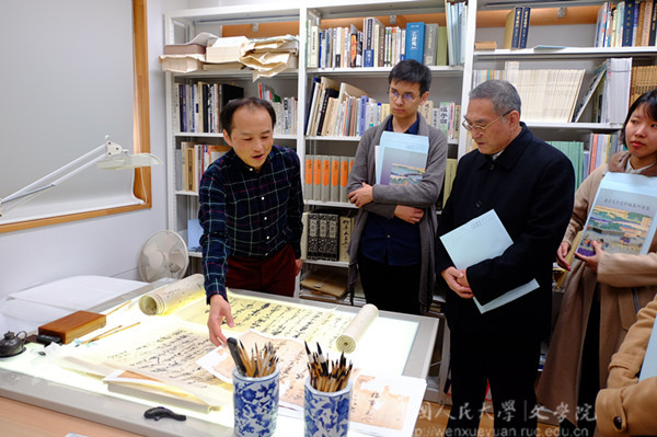 著名影写专家宮崎肇老师向同学们介绍了影写技术的重难点。宫崎老师说,随着照相机的发展,影写工作人员减少,但是要求却越来越高。他展示了影写的方法,首先把原稿放在亮灯的玻璃板上,然后根据情况用粗细不同的毛笔一笔笔描摹,描摹时需要考虑伏案写和卷在手上写形成的不同笔画线条。描摹的另一个困难在于原稿不清晰,这对技术和耐心的要求很高,“有时复写一页原稿需要一个月才能完成”。同学们深切地体会到影写文件的来之不易。
