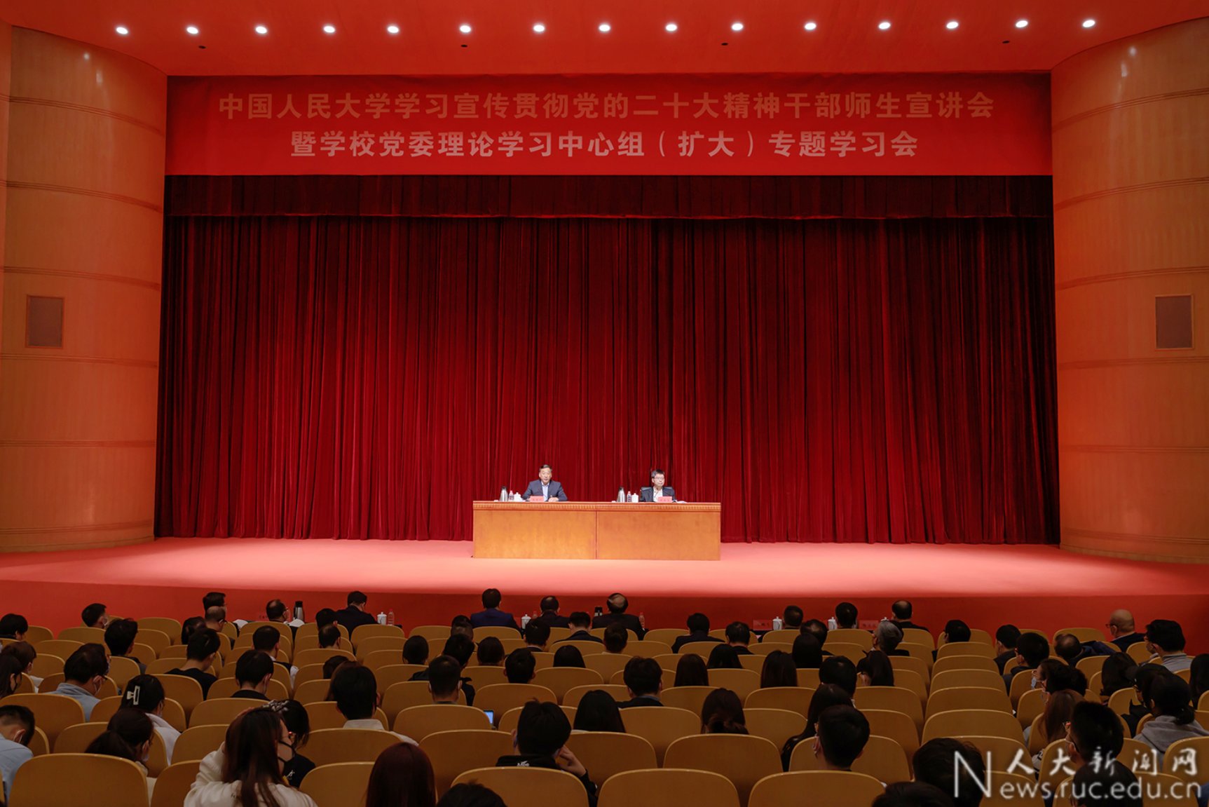 10月24日下午,中国人民大学学习宣传贯彻党的二十大精神干部师生宣讲会暨学校党委理论学习中心组(扩大)专题学习会在明德堂召开。学校党委书记张东刚主持会议并部署学习宣传贯彻党的二十大精神有关工作,校长林尚立宣讲党的二十大精神。