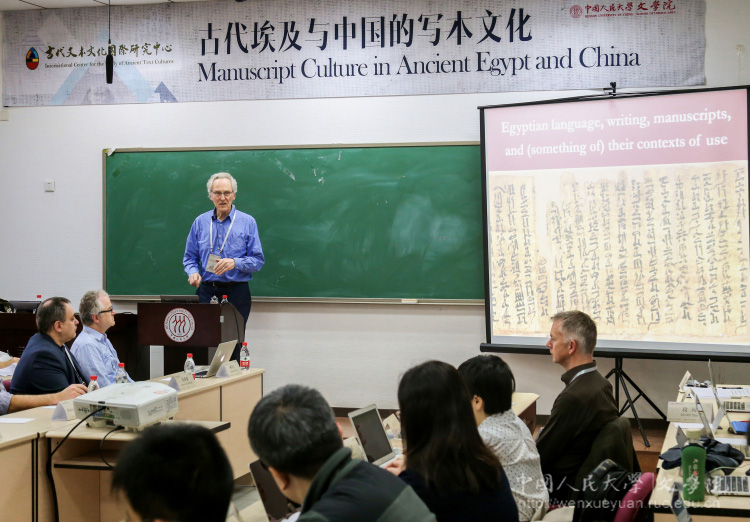 开幕式后,本期工作坊的主要指导老师John Baines教授以“古埃及语言、书写、写本及其使用背景”(Egyptian Language, Writing, Manuscripts, and Their Contexts of Use)为主题,进行首场讲座。基于对传世文本、出土文献及考古文物的剖析,John Baines教授对古埃及语言的使用背景做了可能性推测,深入分析了其语言存在及其书写的基本情况、写本流传的可能性状态。
