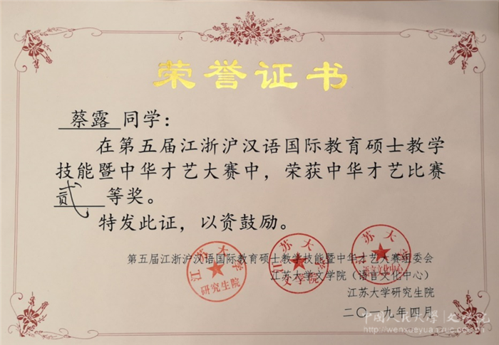 汉语国际教育专业闫亚宁获汉语教学技能比赛中国学生组二等奖、白贺获优秀奖,蔡露获中华才艺比赛二等奖;苏州校区获得优秀组织奖。