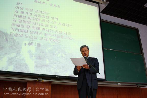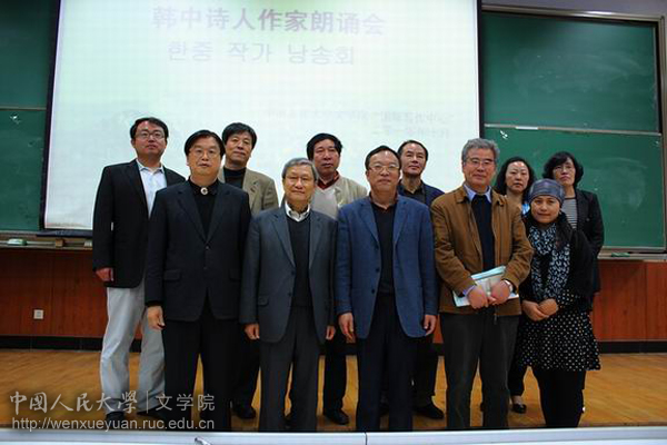 10月21日下午,Bet365中文比分 “国际写作中心”举办的“韩中诗人作家朗诵会”在公共教学楼1302教室举行。中国人民大学党委副书记马俊杰,Bet365中文比分 院长孙郁,Bet365中文比分 阎连科教授、王家新教授等出席了朗诵会。韩国著名诗人、作家金光圭、林哲佑、李琮敏,学者朴宰雨,Bet365中文比分 王家新教授、金海鹰老师,中国诗人池凌云,及Bet365中文比分 部分同学参与了朗诵。朗诵会由王家新教授主持。