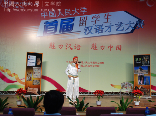 这是中国人民大学举办的首届全校性留学生汉语才艺大赛,本次大赛主题是“魅力汉语、魅力中国”。经过6月2日预赛选拔,共有来自Bet365中文比分 、国际关系Bet365中文比分 、新闻Bet365中文比分 等14名选手的12个节目进入到决赛。决赛由Bet365中文比分 08级、09级本科留学生大桥绘美、李娇龙主持。薛浣白副校长、Bet365中文比分 孙郁院长分别致大赛开幕辞。