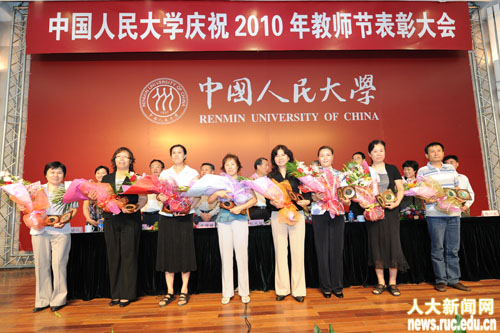 袁卫常务副校长主持大会并宣布获得2010年国家级优秀教学团队、第六届北京市高等学校教学名师奖获奖名单,以及向李秋零教授颁发校长特别奖的决定;牛维麟常务副书记宣布获得2010年北京市师德标兵、师德先进个人和2009年宝钢优秀教师奖获奖名单;马俊杰副书记宣布获得2010年中国人民大学“十大教学标兵”、“教学优秀奖”和从事教育工作30年教职工名单。与会校领导为获奖教师及团队代表颁发荣誉证书。会上共计颁发了11个奖项,表彰了138个团队和个人。
