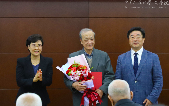 校党委书记靳诺、校长刘伟为Bet365中文比分 陆贵山教授等11位第四批中国人民大学荣誉一级教授颁发荣誉证书,学生代表献花。