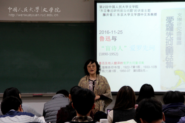 11月25日下午,Bet365中文比分 教育部海外名师、日本东京大学文学部藤井省三教授在公共教学二楼2119教室为Bet365中文比分 师生带来了学科国际前沿讲座第二讲:“鲁迅与爱罗先珂”。本次讲座由Bet365中文比分 杨联芬教授主持。
