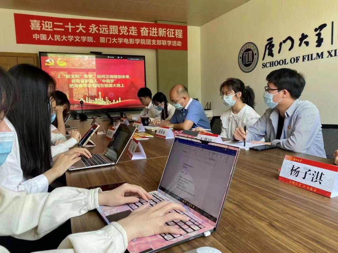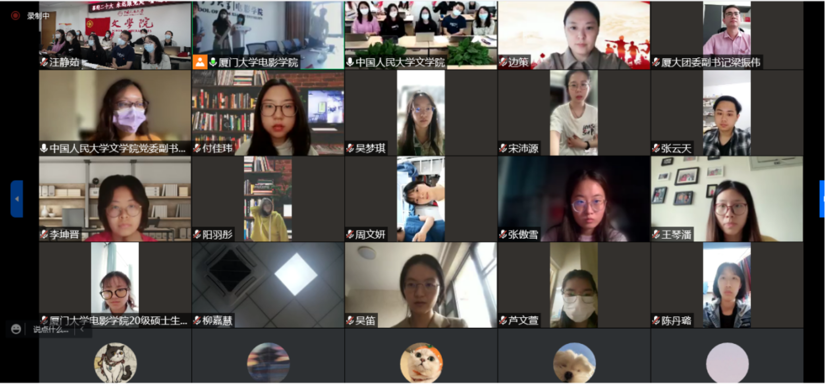 为迎接党的二十大胜利召开,庆祝中国共青团成立一百周年,深入学习贯彻习近平总书记在中国人民大学考察时的重要讲话精神,5月6日上午,Bet365中文比分 与厦门大学电影Bet365中文比分 开展“喜迎二十大,永远跟党走,奋进新征程”团支部联学共建活动。中国人民大学团委副书记边策,Bet365中文比分 党委副书记胡玲莉、团委书记罗观,厦门大学团委副书记梁振伟,电影Bet365中文比分 党委副书记张晴、团委辅导员周钧庭,以及Bet365中文比分 2020级硕士二班团支部和厦门大学电影Bet365中文比分 2020级硕士生团支部共同参与此次活动。因疫情防控要求,本次活动分线上和线下两个会场,两院分会场以视频连线的形式进行。
