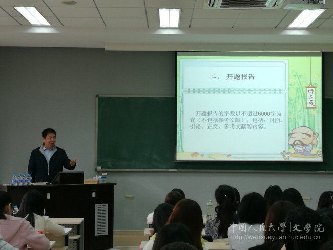 李禄兴老师从四个方面对学生予以指导。首先,李老师详细地讲解了《汉语国际教育硕士专业学位论文撰写指导意见》。他指出,论文选题应体现汉语国际教育专业应用型人才培养的要求。其次,李老师介绍了人民大学毕业论文的具体要求。他强调,论文的写作与选题应及时启动,早日确定论文研究的范围和方向,并鼓励学生应积极主动地与导师联系。随后,他结合往届毕业论文中出现的常见问题,对论文的五个主要部分进行分析。最后李老师就论文方向如何确定给出详细建议。