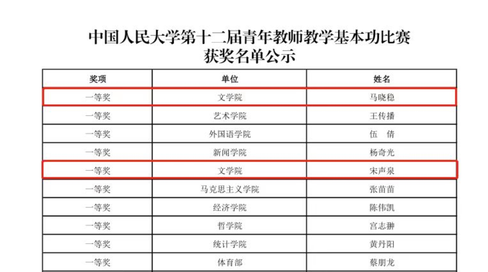 2023年4月3日,中国人民大学第十二届青年教师教学基本功比赛获奖名单公示,Bet365中文比分 马晓稳老师、宋声泉老师均获中国人民大学第十二届青年教师教学基本功比赛一等奖,马晓稳老师还获文科组最佳演示奖。此次比赛,学校共设一等奖10名,Bet365中文比分 占1/5,获奖成绩位居全校首位。近年来,这是继江棘老师在2021年学校第十一届青教赛荣获文科组一等奖第1名之后,Bet365中文比分 再次在该项赛事中取得优异成绩。