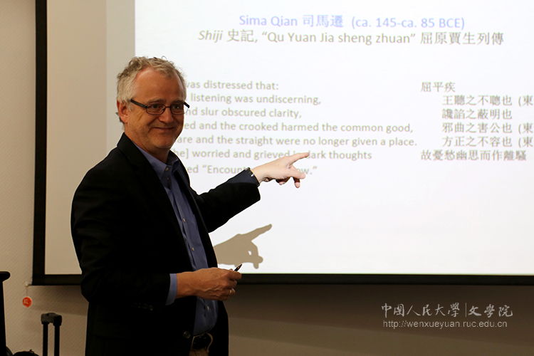 2018年4月8日,普林斯顿大学Greg ('84) and Joanna (P13) Zeluck讲座教授、东亚系主任、中国人民大学古代文本文化国际研究中心主任柯马丁教授应邀在人文楼二层会议室作了题为“《离骚》是一首重组的诗吗”的学术报告。