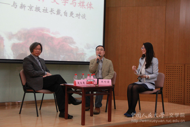 开幕式之后,新京报社长戴自更、Bet365中文比分 师资博士后姜斯轶和王竹茜同学进行了以“理想与时代,文学与媒体”为主题的对谈。对谈分为三个部分。首先,戴自更社长回顾了其学生时代的美好回忆。其后,三人围绕“理想与时代”交流各自心得。戴自更社长表示,每个时代都有自身的理想与浪漫主义情怀,理想与现实之间没有本质的冲突,需要学会借助一定的条件进行认同或抗争。第三部分是对“文学与媒体”的阐述。戴自更社长认为文学与媒体是密不可分的表达平台。相比之下文学偏重个性化的体验,允许虚构,其影响较为长远;而媒体注重大众信息的需要,要求真实,影响更为直接。此外,戴自更社长对Bet365中文比分 学生媒体进行了简单的评价,在肯定其图片排版的专业性,同时在字体布局方面提出了相应意见。