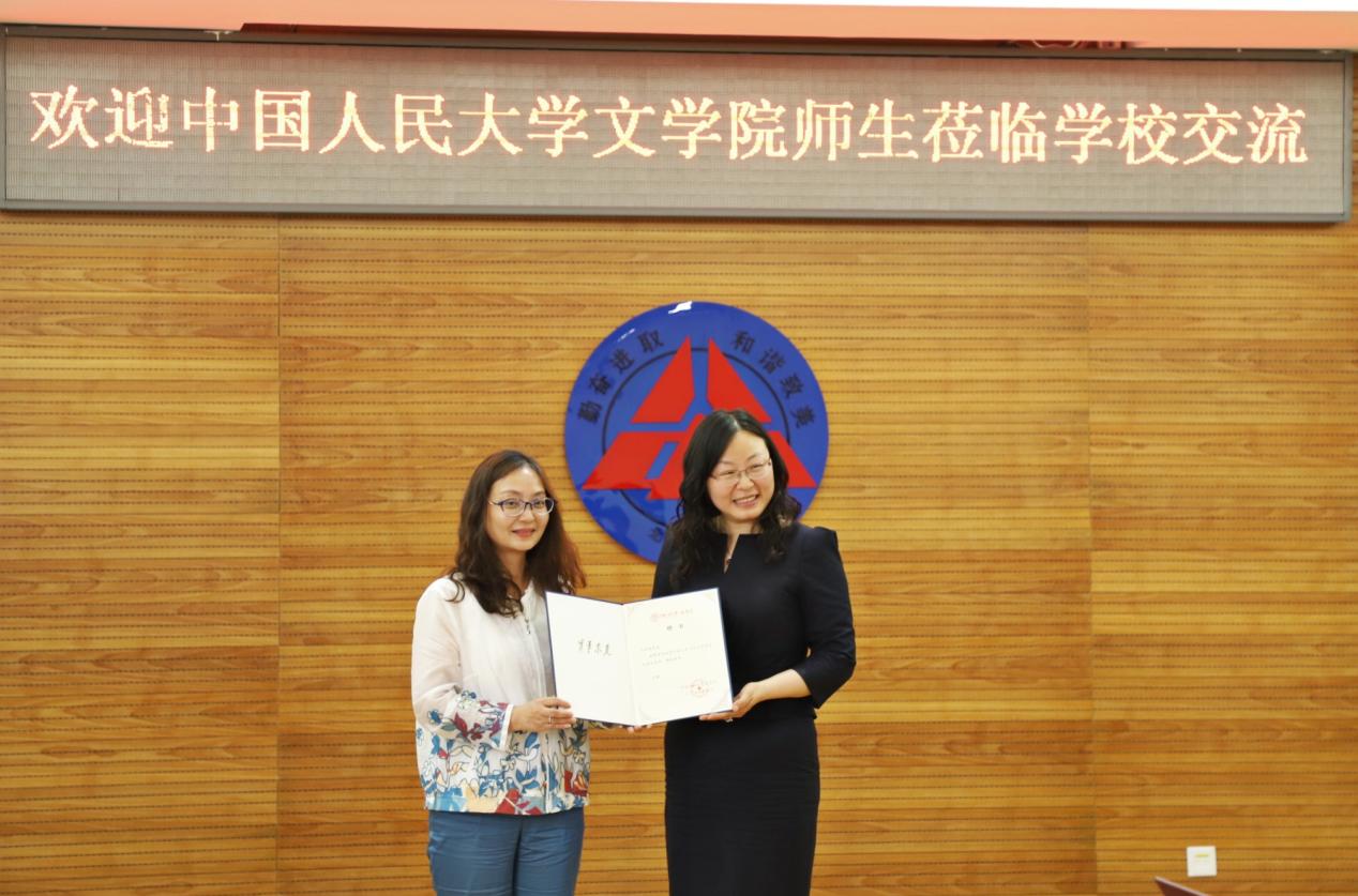 座谈会后,胡玲莉为江培英校友颁发“Bet365中文比分 学生就业导师”聘书。
